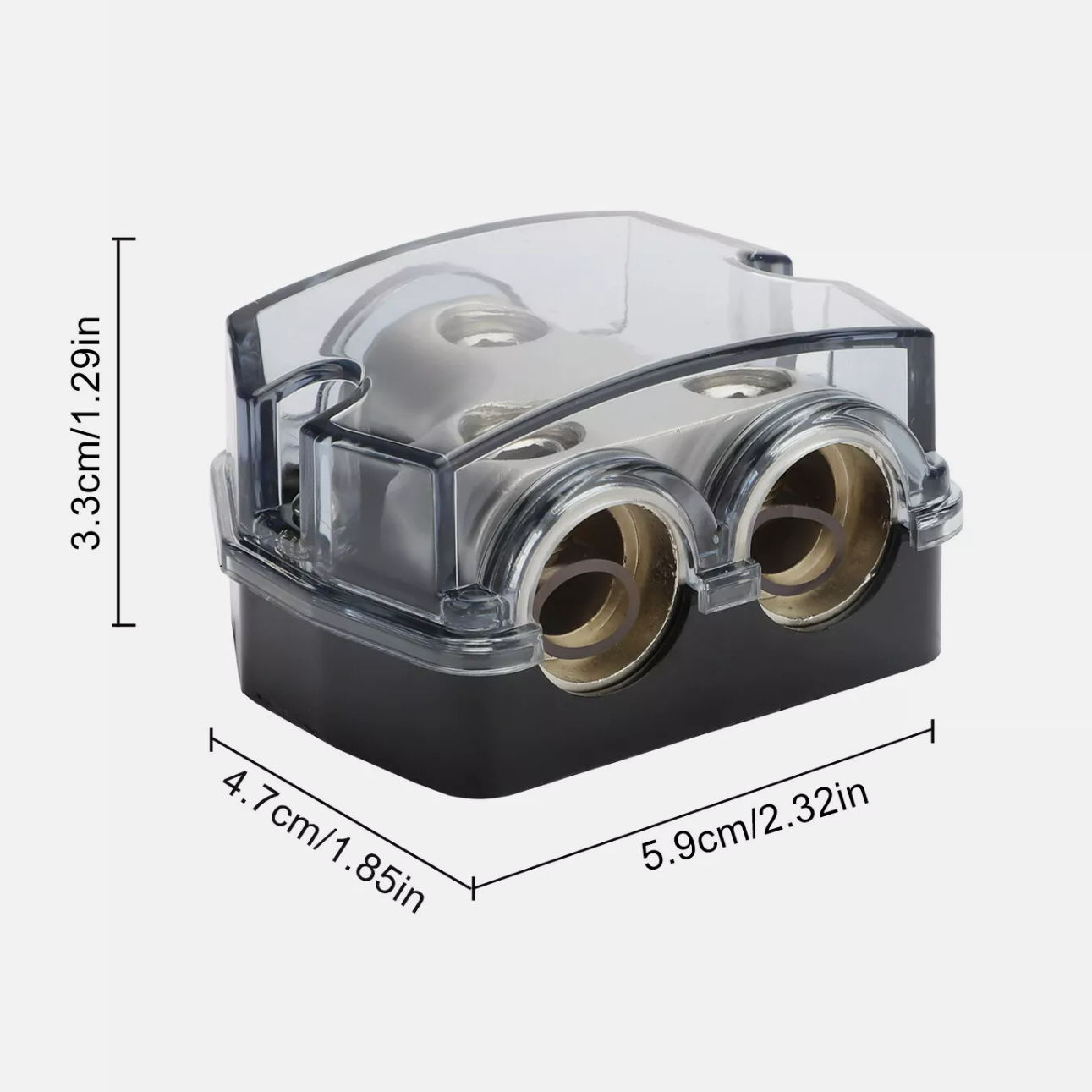 Featuring a 1-way input and 2-way output, this block supports a range of wire gauges, including 0/2/4 gauge for input and 4/8 gauge for output, making it highly versatile for various installations. Its durable zinc alloy construction ensures excellent conductivity, while its corrosion-resistant design guarantees long-lasting performance. The high-temperature polycarbonate base and impact-resistant plastic cover further protect the block, offering superior insulation and durability for your system.