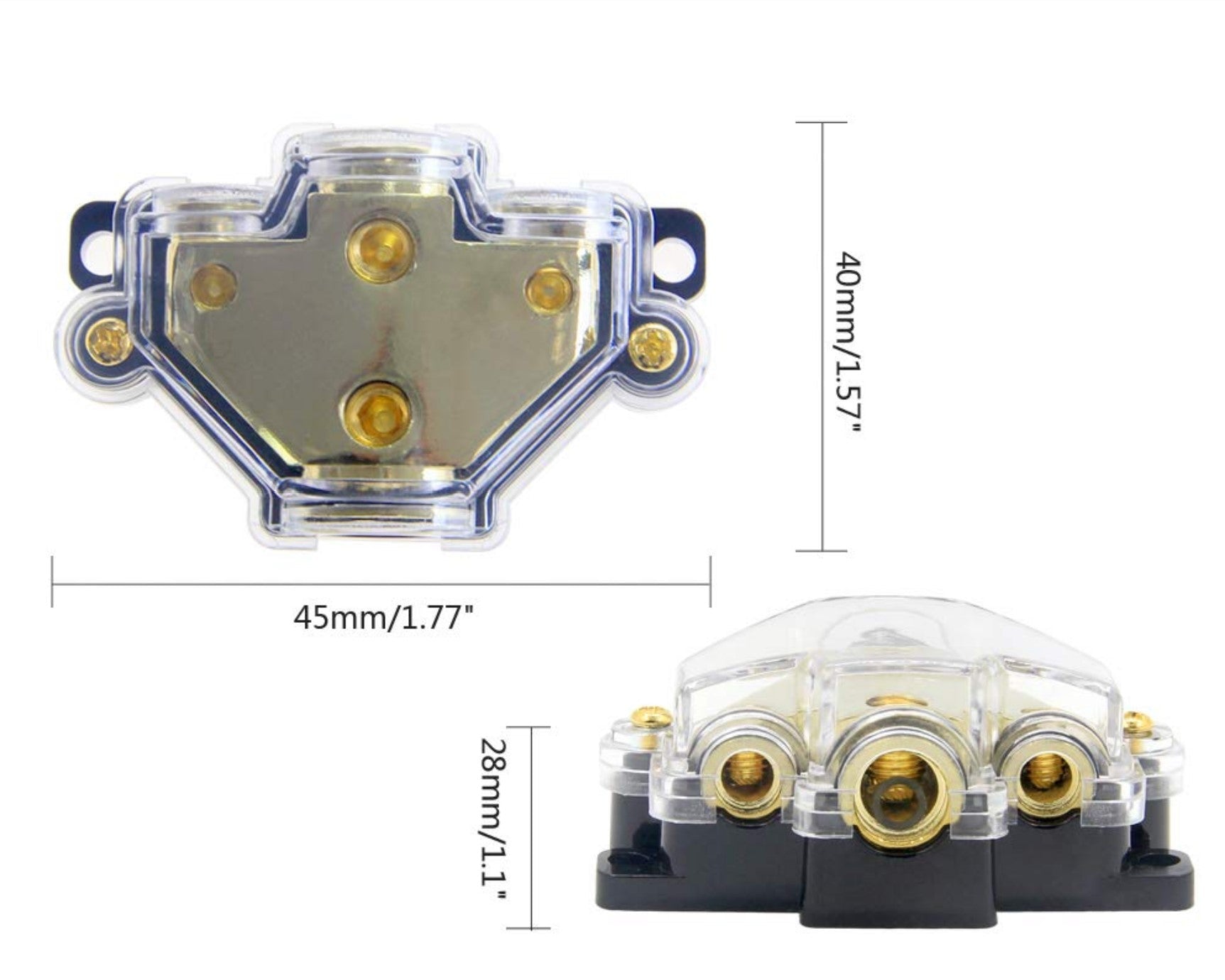 Featuring a 1-way input and 2-way output, this block supports a range of wire gauges, including 0/2/4 gauge for input and 4/8 gauge for output, making it highly versatile for various installations. Its durable zinc alloy construction ensures excellent conductivity, while its corrosion-resistant design guarantees long-lasting performance. The high-temperature polycarbonate base and impact-resistant plastic cover further protect the block, offering superior insulation and durability for your system.