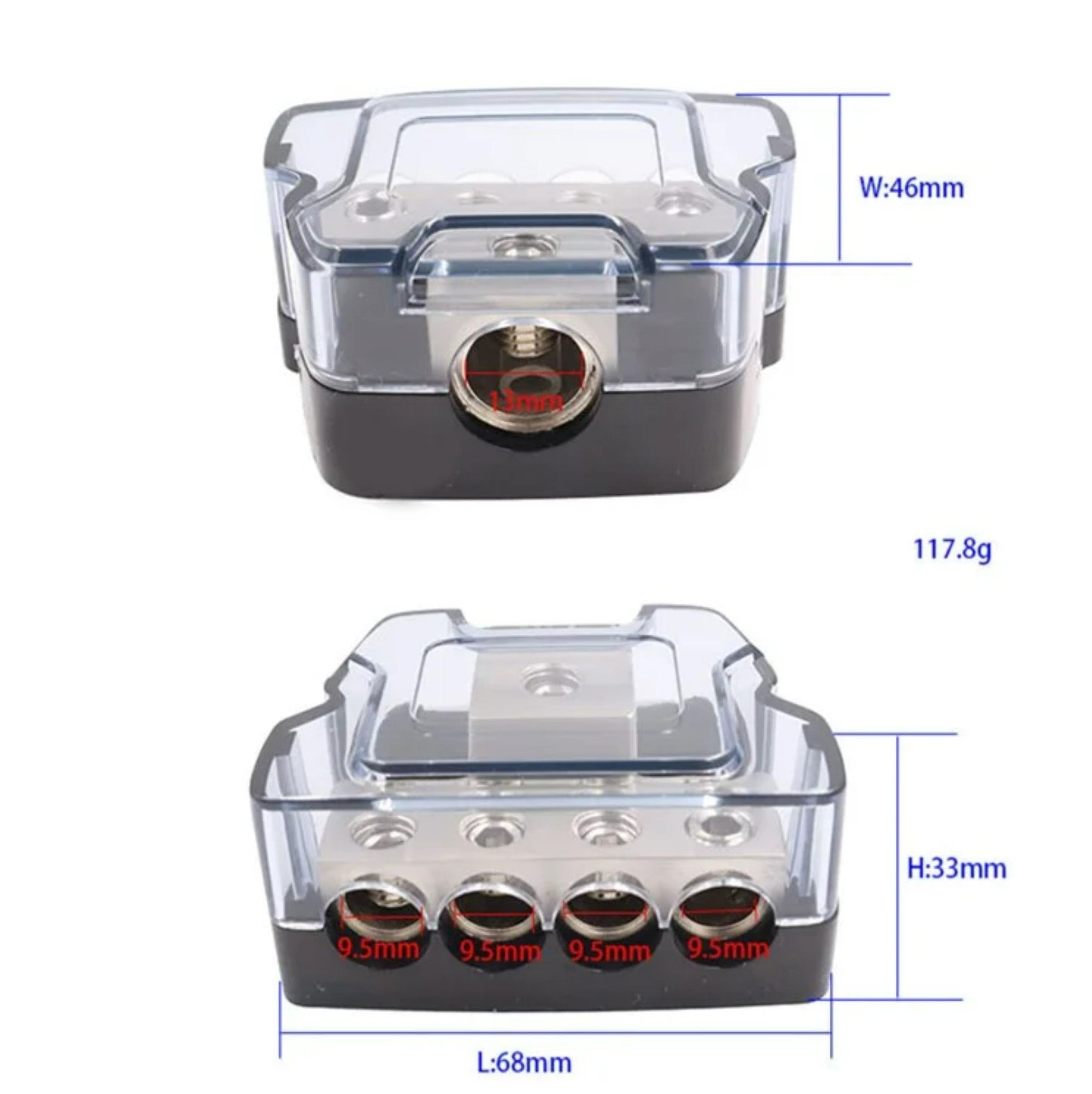 Featuring a 1-way input and 2-way output, this block supports a range of wire gauges, including 0/2/4 gauge for input and 4/8 gauge for output, making it highly versatile for various installations. Its durable zinc alloy construction ensures excellent conductivity, while its corrosion-resistant design guarantees long-lasting performance. The high-temperature polycarbonate base and impact-resistant plastic cover further protect the block, offering superior insulation and durability for your system.